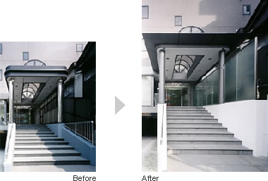 リニューアル前のエントランスは、庇部分や柱の照明等のデザインも無用な凹凸のある古めかしいもので、重苦しい雰囲気があり、ビルへの入館に心理的抵抗が少なからずありました。また隣の民家を隠すように安い黒縁サッシが取り付けられていましたが、階段部分から隣の民家ははっきりと見え、機能面でも清潔感の面でも意図がわからない造りになっていました。更に、照明が柱の上部に設置されている等、ビルの高級感も損なう構造になっていました。