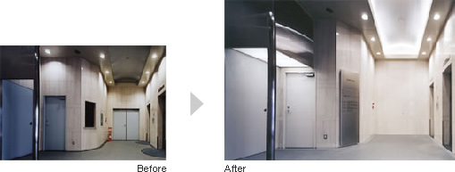 リニューアル時に、使われていない管理人室の窓を各フロアの案内板で覆い隠し、エレベーター脇の不要な扉を封鎖。必要な扉も色をくすんだブルーから清潔感あふれるホワイトにすることで、雑然さを解消し広さを感じる内装にしました。また、エレベーター前のダウンライトに加え間接照明も使用。明るさを増すために壁と床を研磨することにより、明るく清潔感のあるエントランスホールにしました。
