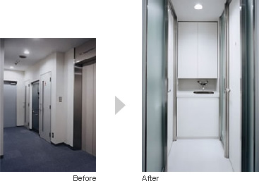 リニューアルの際に、エレベーター前の照明を増加させると共に、専用室側の壁をすりガラスに変更。壁の圧迫感を取り払うと同時に専用室からの光も取り入れ、明るく開放感のあるエレベーターホールを実現。また、モスグリーンと白い壁のコントラストにより清潔感を維持しつつメリハリの利いたビジネススペースを造り出しました。