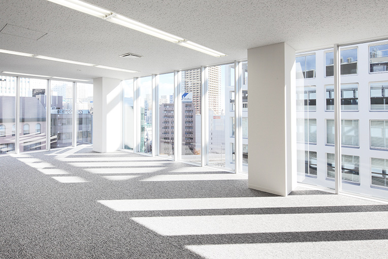 専用室は安心の1フロア1専用室。基準階は49.64坪という面積で北面と東面の2面が全面採光、足元から天井まで続くハイサッシによる抜群の明るさと開放感を誇ります。